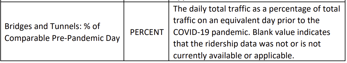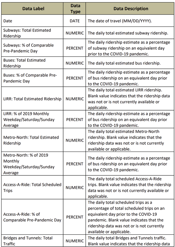 Date | Subways: Total Estimated Ridership | Subways: % of Comparable Pre-Pandemic Day | Buses: Total Estimated Ridership | Buses: % of Comparable Pre-Pandemic Day | LIRR: Total Estimated Ridership | LIRR: % of 2019 Monthly Weekday/Saturday/Sunday Average | Metro-North: Total Estimated Ridership | Metro-North: % of 2019 Monthly Weekday/Saturday/Sunday Average | Access-A-Ride: Total Scheduled Trips | Access-A-Ride: % of Comparable Pre-Pandemic Day | Bridges and Tunnels: Total Traffic | Bridges and Tunnels: % of Comparable Pre-Pandemic Day | |